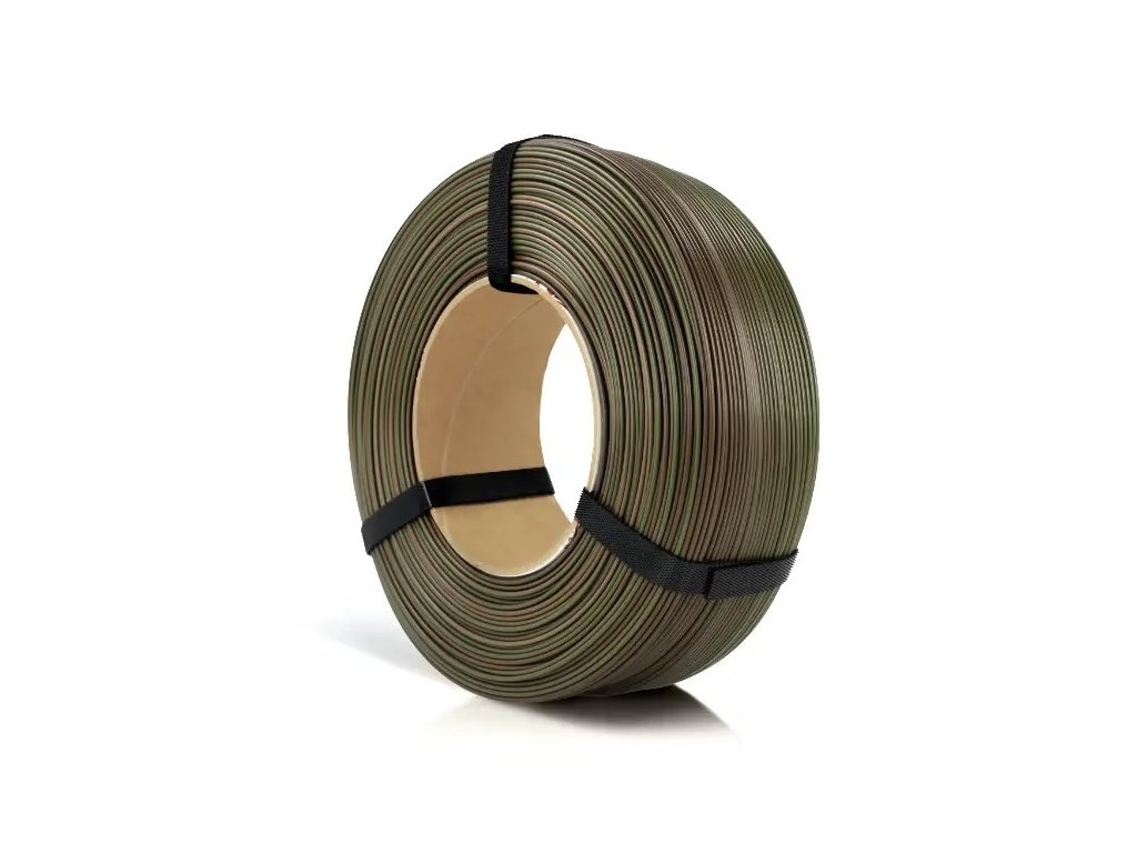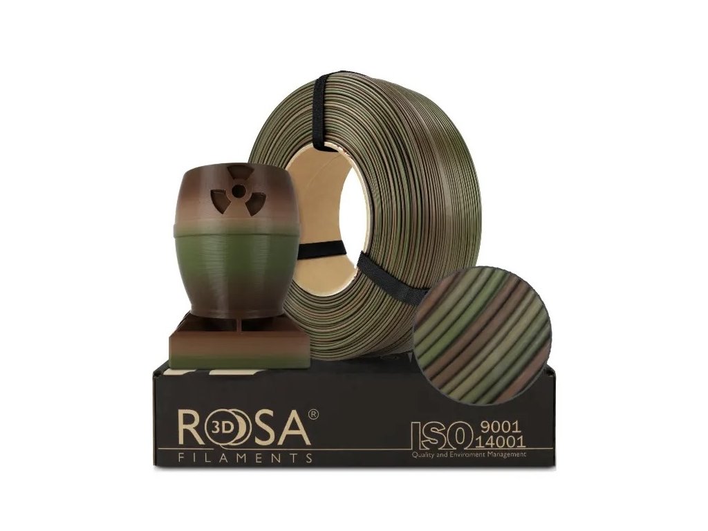 Filament ReFill PLA Rainbow Army Forest Silk od Rosa3D je lesklý 3D tiskový materiál s kterým máme skvělé zkušenosti, barvy jsou krásně syté a stálé, zelených a hnědých odstínů. Jedna cívka (1000 g) obsahuje ohnivé odstíny, přičemž jeden cyklus zahrnuje 200 g filamentu.