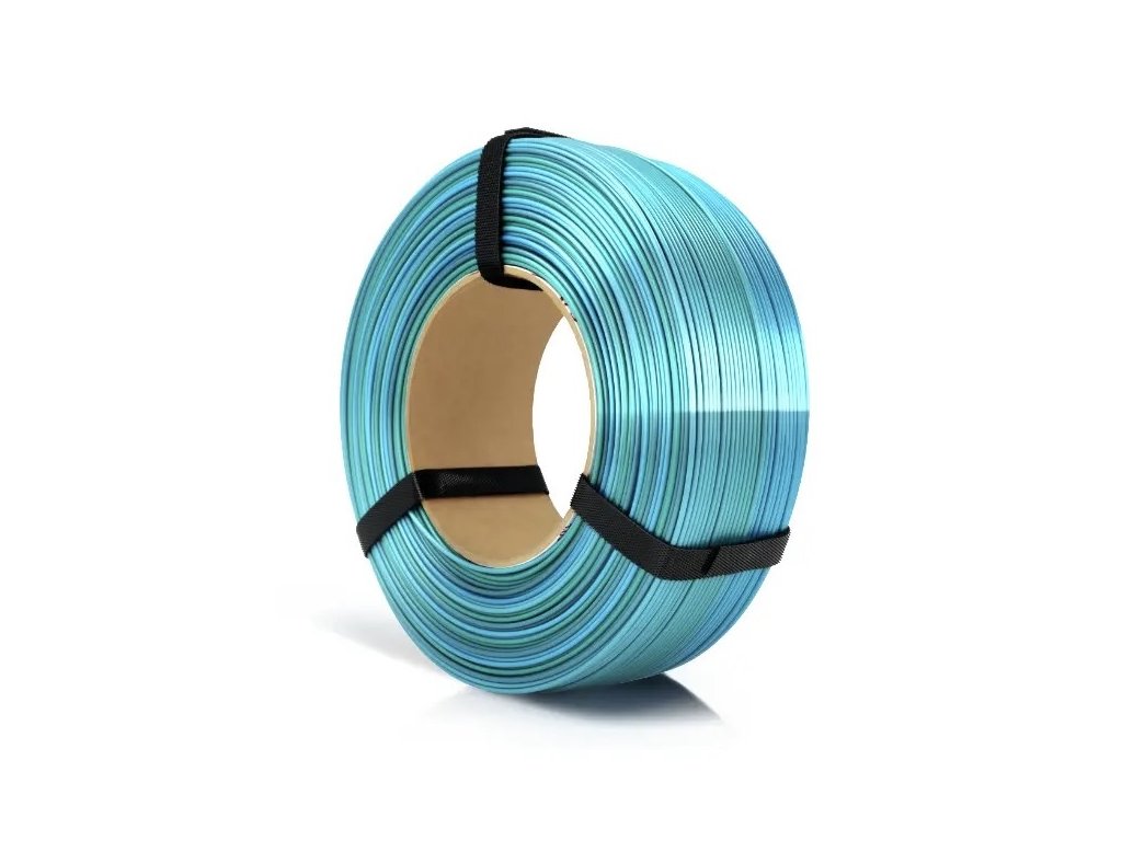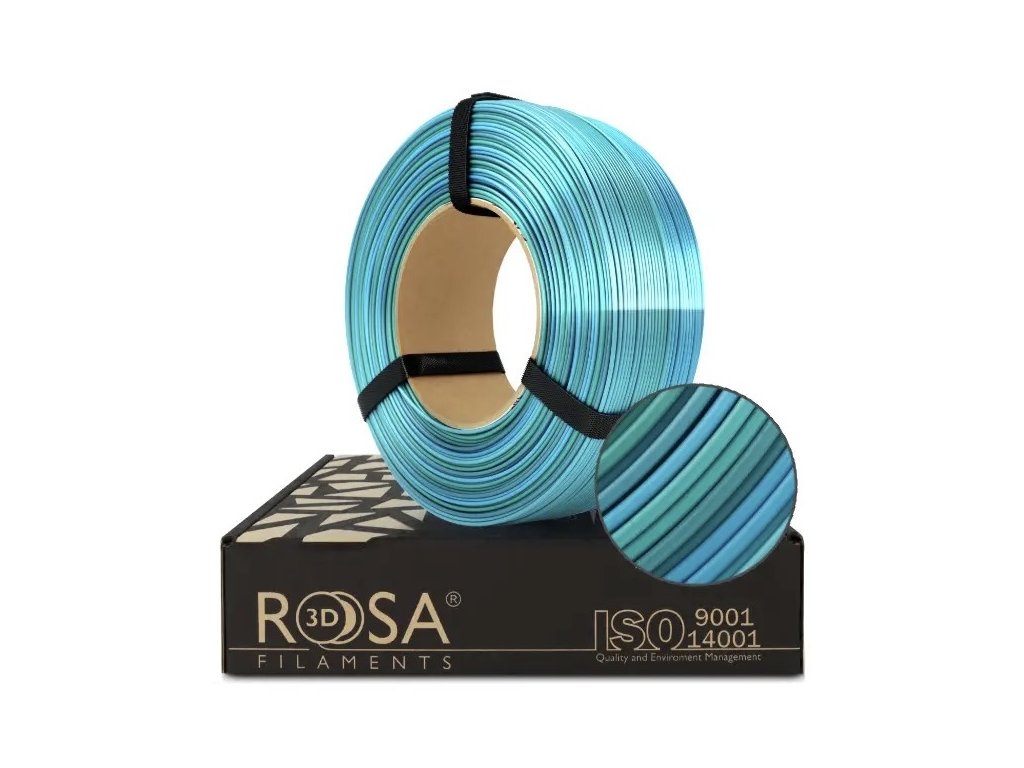 Filament ReFill PLA Rainbow Ocean Silk od Rosa3D je lesklý 3D tiskový materiál s kterým máme skvělé zkušenosti, barvy jsou krásně syté a stálé. Jedna cívka (1000 g) obsahuje odstíny modré a zelené, přičemž jeden cyklus zahrnuje 240 g filamentu.