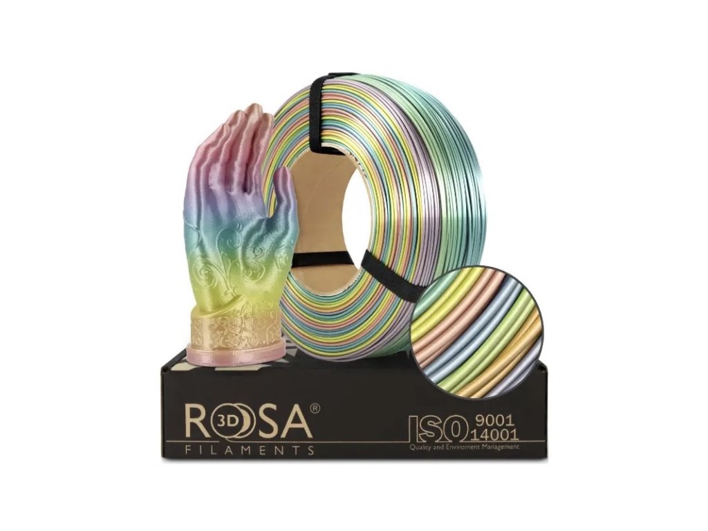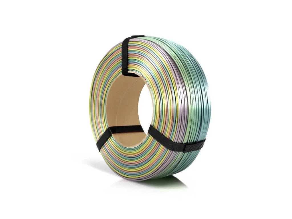 Filament ReFill PLA Rainbow Silk od Rosa3D je lesklý 3D tiskový materiál s kterým máme skvělé zkušenosti, barvy jsou krásně syté a stálé. Jedna cívka (1000 g) obsahuje více než 4 barevné cykly, přičemž jeden cyklus zahrnuje 240 g filamentu.